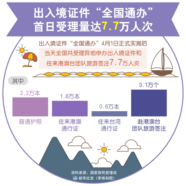 新華社北京4月2日電 記者2日從國家移民管理局獲悉,出入境證件“全國通辦”1日正式實施后,當天全國共受理異地申辦出入境證件和往來港澳臺團隊旅游簽注7.7萬人次,其中普通護照2.2萬本、往來港澳通行證1.8萬本、往來臺灣通行證0.6萬本、赴港澳臺團隊旅游簽注3.1萬個。