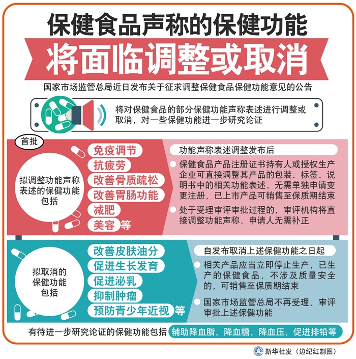新華社北京4月2日電(記者趙文君)為進(jìn)一步加強(qiáng)保健食品保健功能聲稱管理,國(guó)家市場(chǎng)監(jiān)管總局近日發(fā)布關(guān)于征求調(diào)整保健食品保健功能意見的公告,將對(duì)保健食品的部分保健功能聲稱表述進(jìn)行調(diào)整或取消,對(duì)一些保健功能進(jìn)一步研究論證。