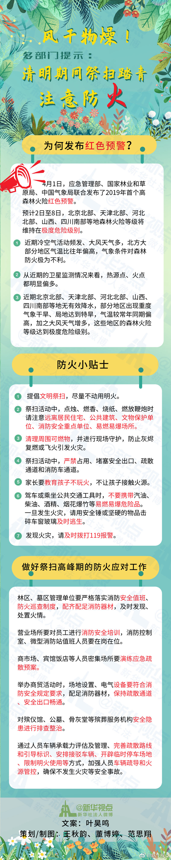“此次紅色預(yù)警是三部門綜合考慮氣象條件、林區(qū)物候及衛(wèi)星林火監(jiān)測、清明節(jié)期間祭掃影響等情況,經(jīng)過會商研判共同發(fā)布的。”中國氣象局公共氣象服務(wù)中心副首席楊曉丹說,自3月初以來,北京、河北、陜西、四川等地的森林火險等級已持續(xù)近一個月居高不下,近期冷空氣活動頻發(fā)、大風(fēng)天氣多,北方大部分地區(qū)氣溫比往年偏高,氣象條件對森林防火極為不利。