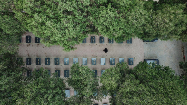 3月21日,張景憲走在張和莊烈士陵園內(nèi)(無人機(jī)拍攝)。