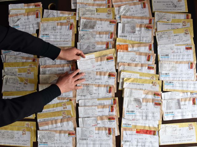 3月20日,張景憲在整理多年來他收到的退信。
