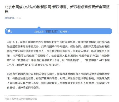 新浪網(wǎng)負(fù)責(zé)人表示,將嚴(yán)格落實(shí)網(wǎng)信部門管理要求,在全面深入整改期間對(duì)問題突出的PC端“新浪博客”和“新浪看點(diǎn)”平臺(tái)自行暫停更新1個(gè)月,對(duì)“新浪新聞”、“新浪博客”APP下架1個(gè)月,時(shí)間從4月17日15時(shí)至5月17日15時(shí)。