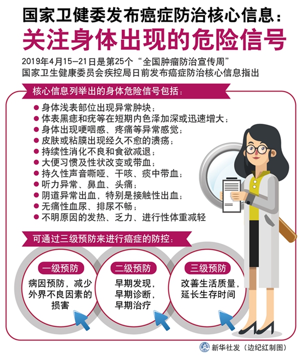 圖表:國家衛(wèi)健委發(fā)布癌癥防治核心信息:關(guān)注身體出現(xiàn)的危險信號 新華社發(fā) 邊紀(jì)紅 制圖