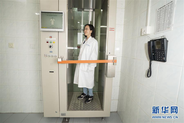 在中核集團中國原子能科學(xué)研究院,媒體記者在參觀完中國先進研究堆后,都要經(jīng)過一個特別的安檢門,通過檢測確定沒有受到輻射污染才能夠離開(4月17日攝)。新華社記者 才揚 攝