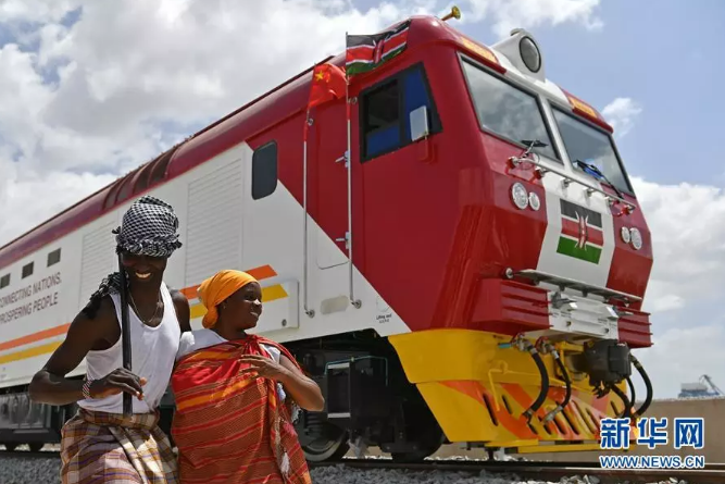 2017年1月11日,在肯尼亞蒙巴薩,當地民眾在中國承制的蒙內鐵路首批內燃機車旁載歌載舞。新華社記者孫瑞博攝