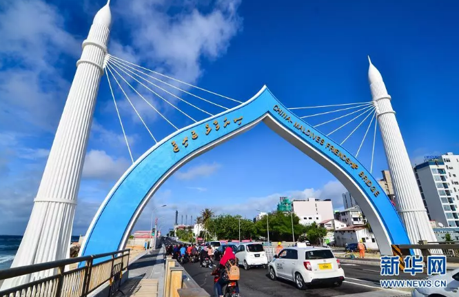2018年10月2日,車輛從由中國援建、連接馬爾代夫首都馬累和機場島的中馬友誼大橋橋頭拱門穿過。新華社發(fā)(杜才良 攝)
