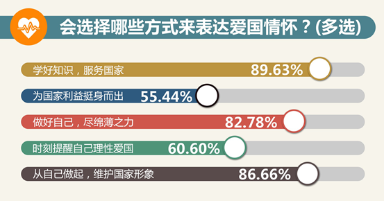 大學(xué)生表達(dá)愛國(guó)的方式更加務(wù)實(shí),94.03%的受訪者認(rèn)為“理性愛國(guó)是最好的方式”。超過80%的大學(xué)生認(rèn)為愛國(guó)要先從自己做起,“學(xué)好知識(shí)、服務(wù)國(guó)家”“做好自己,為社會(huì)盡綿薄之力”等成為很多大學(xué)生的首選。陜西師范大學(xué)學(xué)生強(qiáng)德平說,愛國(guó)有三點(diǎn),第一是銘記歷史,第二是展望未來,第三是把握當(dāng)下。中國(guó)人民大學(xué)學(xué)生張嘯寒說,走到人民生產(chǎn)實(shí)踐的第一線,是關(guān)心國(guó)家和社會(huì)的最好方式。