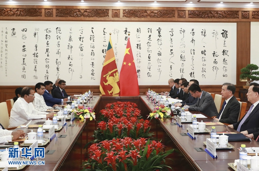 5月14日,全國(guó)政協(xié)主席汪洋在北京釣魚臺(tái)國(guó)賓館會(huì)見斯里蘭卡總統(tǒng)西里塞納。 新華社記者 丁林 攝