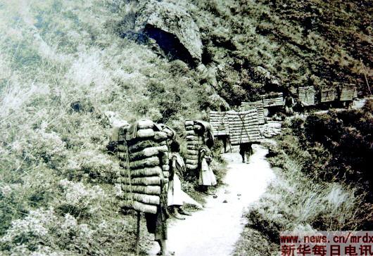 這是1903年法國(guó)人方蘇雅拍攝的四川背夫從瀘定背茶到康定的照片。新華社資料片