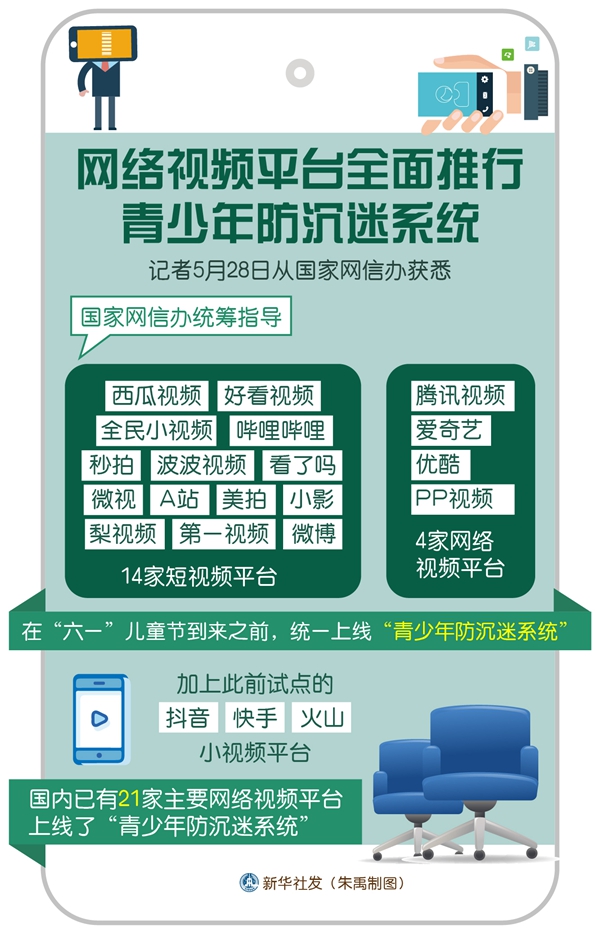 新華社北京5月28日電(記者余俊杰)記者28日從國(guó)家網(wǎng)信辦獲悉,國(guó)家網(wǎng)信辦統(tǒng)籌指導(dǎo)西瓜視頻、好看視頻、全民小視頻、嗶哩嗶哩、秒拍、波波視頻、看了嗎、微視、A站、美拍、小影、梨視頻、第一視頻、微博等14家短視頻平臺(tái),以及騰訊視頻、愛奇藝、優(yōu)酷、PP視頻等4家網(wǎng)絡(luò)視頻平臺(tái),在“六一”兒童節(jié)到來之前,統(tǒng)一上線“青少年防沉迷系統(tǒng)”。