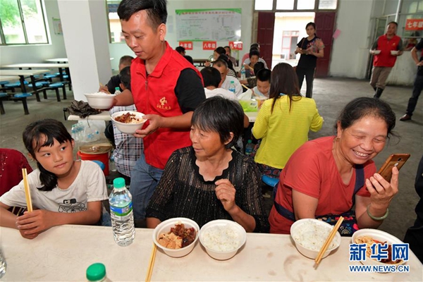 6月9日,在江西省吉安市永新縣高橋樓鎮(zhèn)高橋中學(xué)安置點(diǎn)內(nèi),志愿者為受災(zāi)村民端來熱飯熱菜。新華社記者 彭昭之 攝