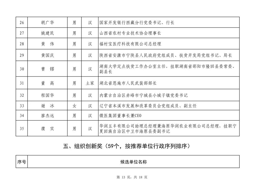根據(jù)國(guó)務(wù)院扶貧開(kāi)發(fā)領(lǐng)導(dǎo)小組印發(fā)的《2019年全國(guó)脫貧攻堅(jiān)獎(jiǎng)評(píng)選表彰工作方案》,經(jīng)全國(guó)脫貧攻堅(jiān)獎(jiǎng)評(píng)選委員會(huì)初次評(píng)審,以下140名人選和59個(gè)單位作為2019年全國(guó)脫貧攻堅(jiān)獎(jiǎng)初評(píng)候選人(單位),現(xiàn)予以公示。