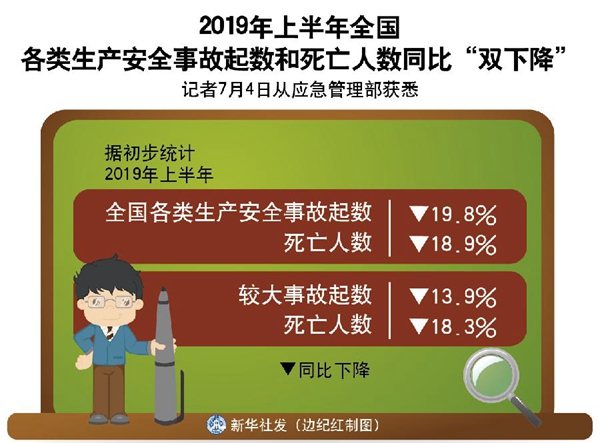 新華社北京7月4日電(記者魏玉坤、葉昊鳴)記者4日從應(yīng)急管理部獲悉,據(jù)初步統(tǒng)計(jì),今年上半年,全國(guó)各類生產(chǎn)安全事故起數(shù)和死亡人數(shù)同比分別下降19.8%和18.9%,較大事故起數(shù)和死亡人數(shù)同比分別下降13.9%和18.3%。