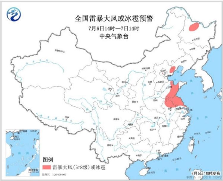 預計7月6日14時至7日14時,黑龍江北部、河北東北部、山東中部、安徽北部、江蘇中北部等地的部分地區(qū)將有8-10級雷暴大風或冰雹天氣,局地將出現(xiàn)極端雷暴大風,瞬時風力可達10級以上;黑龍江北部、遼寧西部、河北東部、北京東部、天津、山東中部、安徽東北部、江蘇中北部、云南西部和北部、貴州南部、湖南中南部、江西中部、浙江北部和南部、福建中北部、廣西北部以及廣東北部等地的部分地區(qū)將有短時強降水,小時雨量20-50毫米,局地可達70毫米以上。
