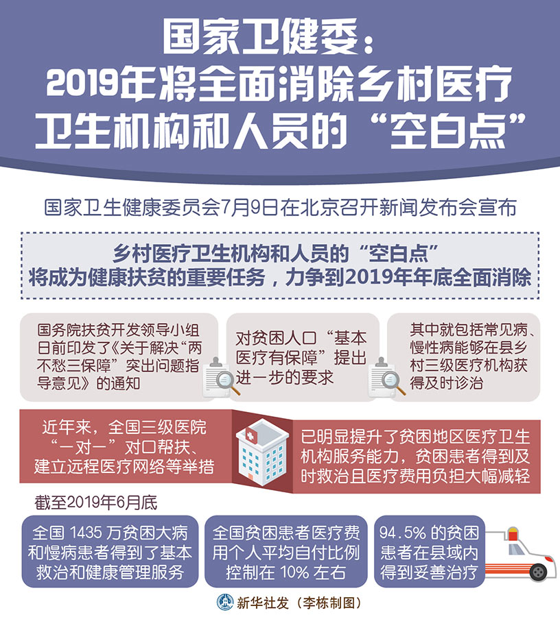 新華社北京7月9日電(記者屈婷、王秉陽)少數(shù)地區(qū)仍有衛(wèi)生室“空白村”,“三區(qū)三州”深度貧困地區(qū)有的鄉(xiāng)鎮(zhèn)缺少全科醫(yī)生……國家衛(wèi)生健康委員會9日在京召開新聞發(fā)布會宣布,像上述這些鄉(xiāng)村醫(yī)療衛(wèi)生機構和人員的“空白點”,將成為健康扶貧的重要任務,力爭到今年年底全面消除。