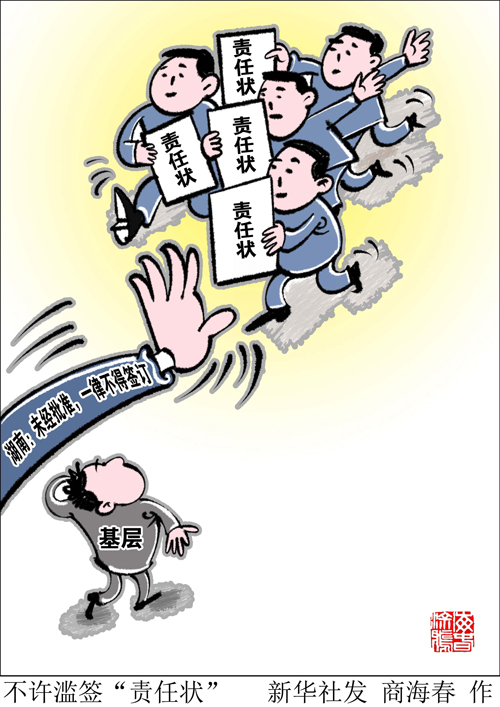 一味問(wèn)責(zé)導(dǎo)致部分基層干部“虱多不癢、債多不愁”。一名基層干部向半月談?dòng)浾邇A訴:自己跑到縣里一個(gè)會(huì)場(chǎng),“埋頭就在一沓責(zé)任狀上簽字,也不看是關(guān)于什么內(nèi)容,反正出了事責(zé)任都在鄉(xiāng)鎮(zhèn)”。他以該省新出臺(tái)的一份關(guān)于防控兒童青少年近視的文件舉例說(shuō),里面仍然要求“省與市簽責(zé)任書,市以下政府逐級(jí)簽責(zé)任書”。