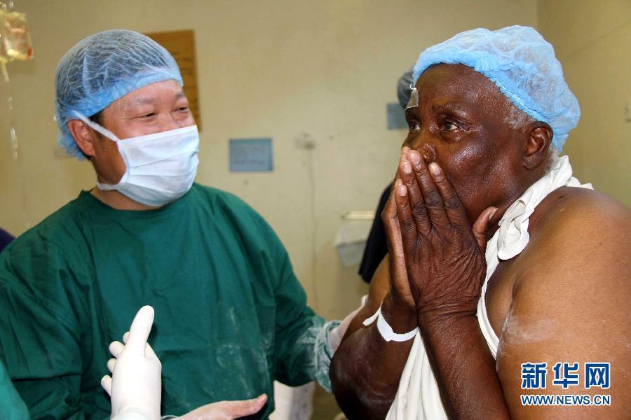 2010年11月23日,在津巴布韋首都哈拉雷郊區(qū)的奇通圭扎中心醫(yī)院,一位老人(右)在中國(guó)“非洲光明行”醫(yī)療隊(duì)為其實(shí)施復(fù)明手術(shù)后重見光明,驚喜萬(wàn)分。 新華社記者 李平 攝