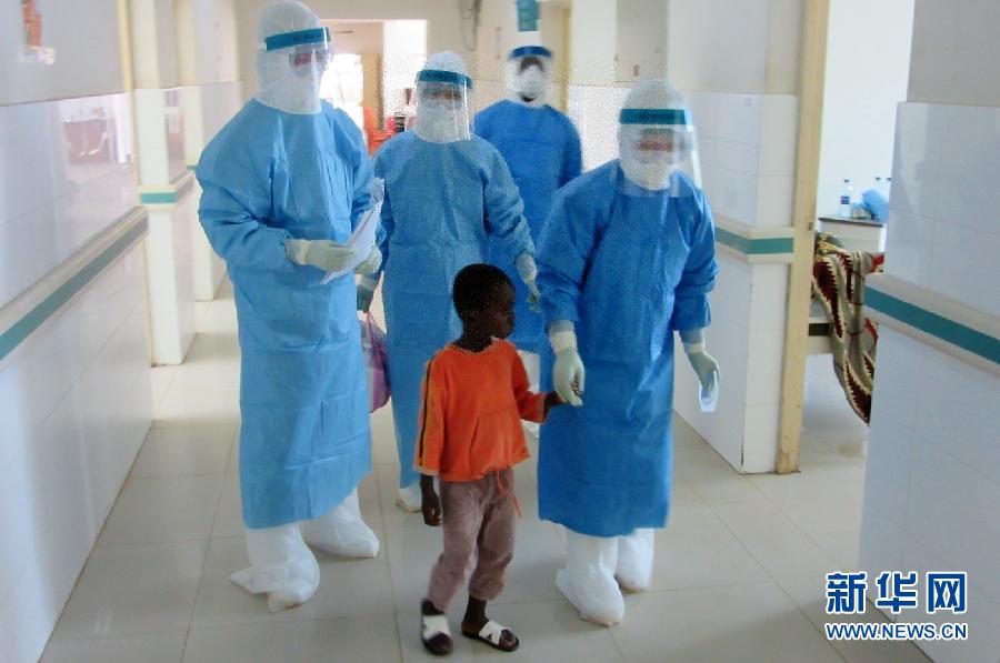 2014年10月11日,在塞拉利昂首都弗里敦,來(lái)自中國(guó)的醫(yī)護(hù)人員護(hù)送埃博拉留觀患者進(jìn)入病房。新華社發(fā)(孫捷 攝)
