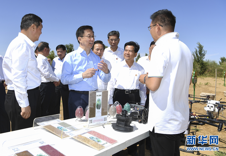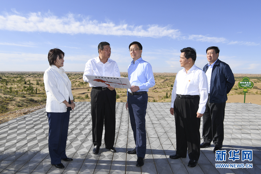 8月26日至27日,中共中央政治局常委、國務(wù)院副總理韓正到內(nèi)蒙古自治區(qū)鄂爾多斯市,就庫布其沙漠防沙治沙和生態(tài)建設(shè)情況進行調(diào)研。這是8月27日,韓正在那日沙科技植樹區(qū),考察運用技術(shù)創(chuàng)新植樹治沙工作開展情況。新華社記者 張領(lǐng) 攝