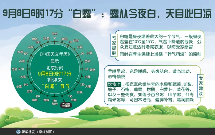 新華社天津9月6日電(記者周潤(rùn)?。皯{闌久,金波漸轉(zhuǎn),白露點(diǎn)蒼苔?!薄吨袊?guó)天文年歷》顯示,北京時(shí)間9月8日6時(shí)17分將迎來(lái)“白露”節(jié)氣。專家提醒說(shuō),此時(shí)節(jié)“秋老虎”將逝去,氣溫開始下降,天氣逐漸轉(zhuǎn)涼,公眾要注意養(yǎng)氣潤(rùn)燥。
