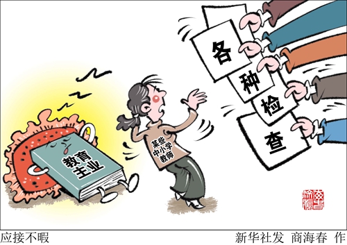 事實(shí)上,早在今年3月中辦就發(fā)布《關(guān)于解決形式主義突出問題為基層減負(fù)的通知》,強(qiáng)調(diào)今年要解決一些困擾基層的形式主義問題,切實(shí)為基層減負(fù)。“新華視點(diǎn)”記者近日調(diào)查發(fā)現(xiàn),在一些地方的中小學(xué),各種檢查以及與教學(xué)無關(guān)的活動(dòng)紛紛進(jìn)校園,令教師們不堪重負(fù)甚至影響了教學(xué)工作。