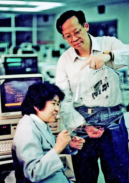 王選與妻子陳堃銶一起查看漢字激光照排系統(tǒng)輸出的排版膠片。(1994年攝,資料照片)
