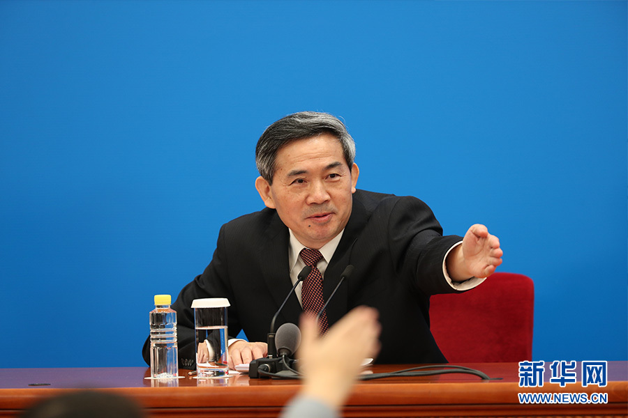 十三屆全國人大二次會議3月4日上午11時(shí)15分在人民大會堂新聞發(fā)布廳舉行新聞發(fā)布會,由大會發(fā)言人張業(yè)遂就大會議程和人大工作相關(guān)的問題回答中外記者提問。圖為新聞發(fā)布會主持人何紹仁。新華網(wǎng)/中國政府網(wǎng) 陳杰 攝