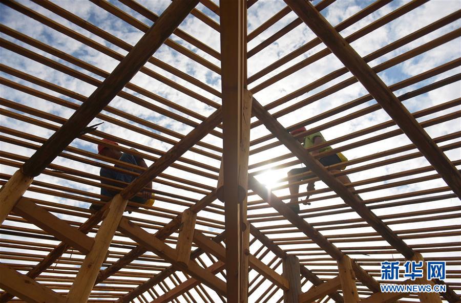 在湖北省宣恩縣曉關(guān)侗族鄉(xiāng),工人在建設(shè)吊腳樓(2018年7月26日攝)。2018年,當(dāng)?shù)卣_始修建6座新的侗寨吊腳樓,為符合易地搬遷政策的貧困戶實施搬遷。新華社發(fā)(王俊 攝)