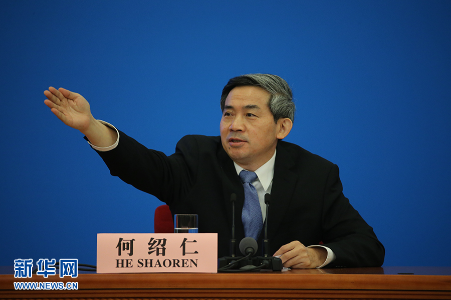 3月15日上午十三屆全國人大二次會議閉幕后,國務(wù)院總理李克強(qiáng)在人民大會堂三樓金色大廳會見采訪十三屆全國人大二次會議的中外記者并回答記者提出的問題。圖為記者會主持人何紹仁。新華網(wǎng)/中國政府網(wǎng) 劉廈 攝??