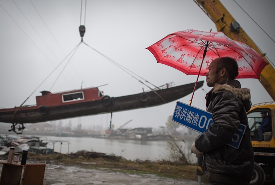 在長江新螺段白鱀豚國家級(jí)自然保護(hù)區(qū)漁船拆解現(xiàn)場(chǎng),漁民夏明星注視著被吊起的漁船(2019年12月25日攝)。新華社記者?肖藝九/攝