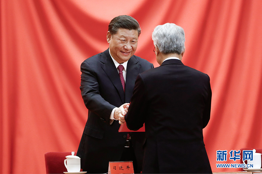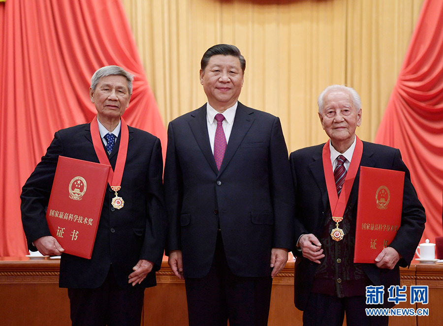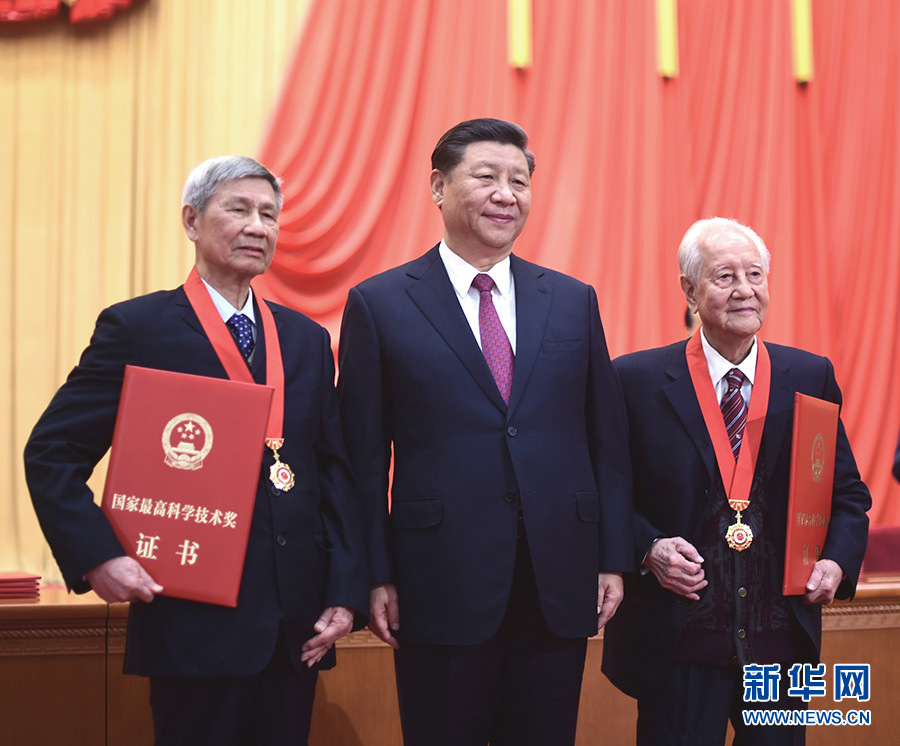 1月10日,2019年度國家科學(xué)技術(shù)獎(jiǎng)勵(lì)大會在北京人民大會堂隆重舉行。這是習(xí)近平等黨和國家領(lǐng)導(dǎo)人同獲得2019年度國家最高科學(xué)技術(shù)獎(jiǎng)的原中國船舶重工集團(tuán)公司第七一九研究所黃旭華院士和中國科學(xué)院大氣物理研究所曾慶存院士一道,為獲得國家自然科學(xué)獎(jiǎng)、國家技術(shù)發(fā)明獎(jiǎng)、國家科學(xué)技術(shù)進(jìn)步獎(jiǎng)和中華人民共和國國際科學(xué)技術(shù)合作獎(jiǎng)的代表頒發(fā)證書。 新華社記者 李學(xué)仁 攝