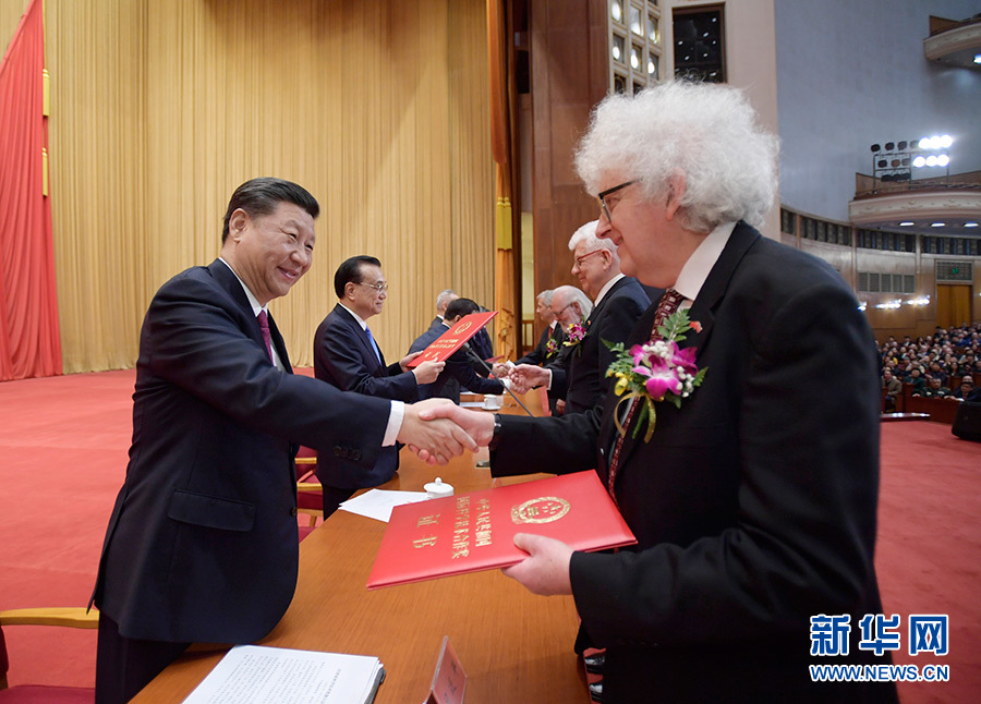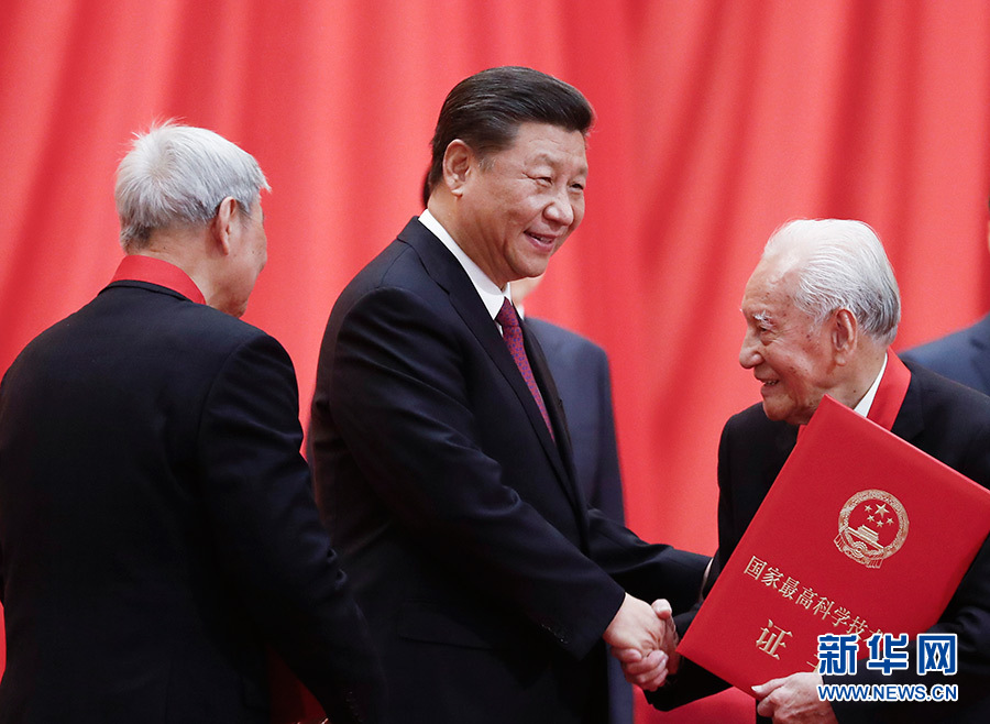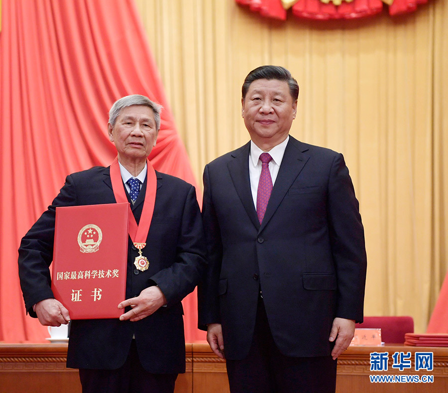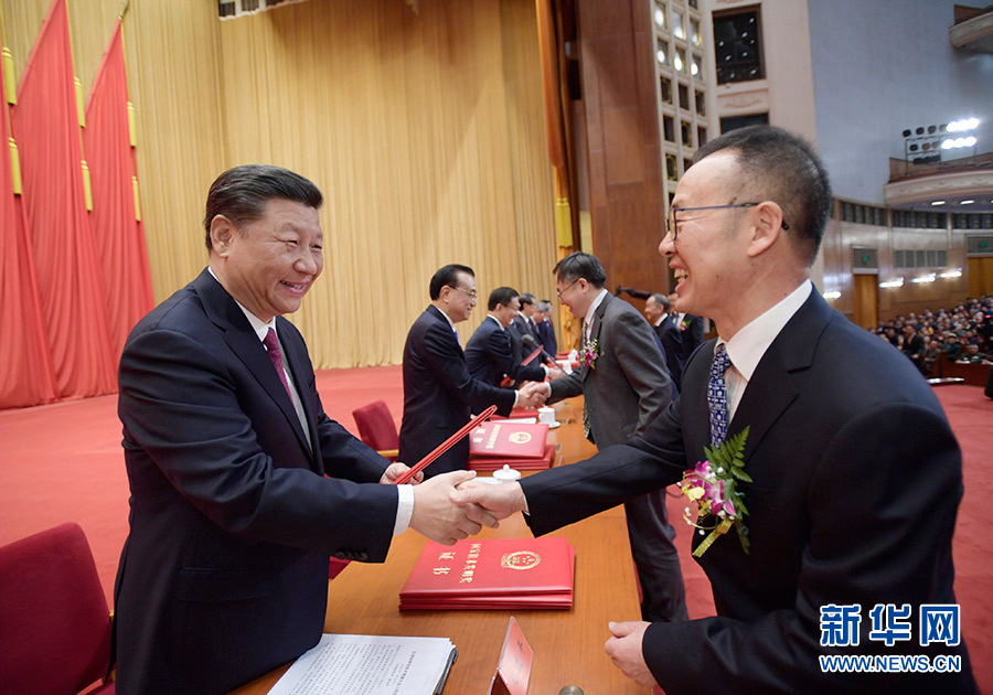 1月10日,2019年度國家科學(xué)技術(shù)獎(jiǎng)勵(lì)大會在北京人民大會堂隆重舉行。這是中共中央總書記、國家主席、中央軍委主席習(xí)近平向獲獎(jiǎng)代表頒發(fā)證書。 新華社發(fā)(盛佳鵬 攝)