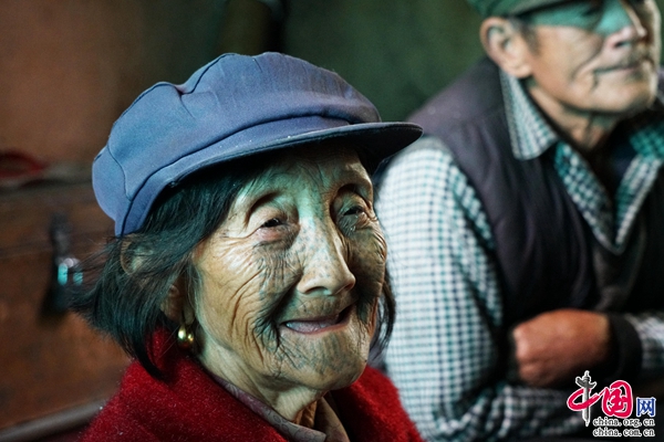 坐在火塘邊的肯國芳老人,寧靜而安詳,在她的臉上,紋滿了青藍(lán)色花紋。從眉心到下顎,圖案以鼻梁為中軸線向兩邊散去,對稱分布。仔細(xì)觀察,嘴唇下方的豎形紋修長,鼻梁中的圖案密集,清晰可見。
