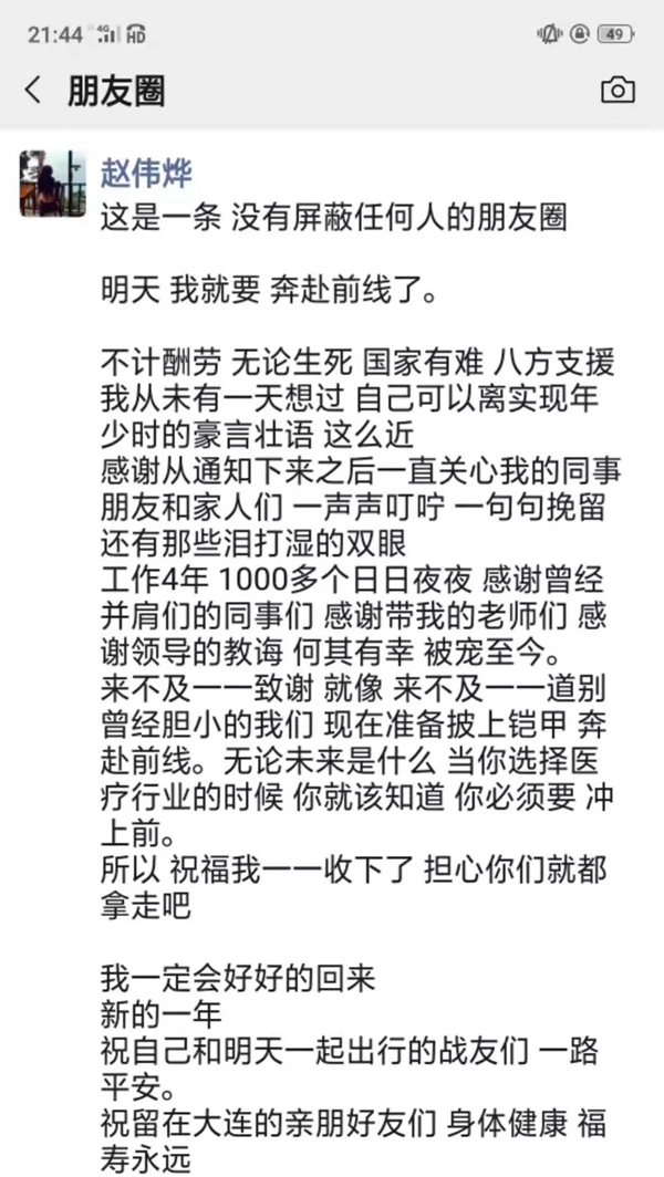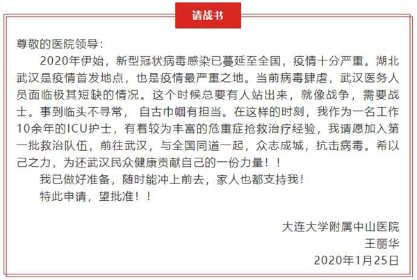 通知下發(fā)后,大連各大醫(yī)院醫(yī)護(hù)人員紛紛主動請纓:“只要被需要,義無反顧,放心吧主任,我強(qiáng)壯”“主任,我也可以去武漢,等待您的派遣”“一切聽從組織安排”“需要我們的時候到了,沒有硝煙的戰(zhàn)場需要我們,我自愿加入抗擊疫情的隊伍”……醫(yī)院微信群里被自愿報名聲刷屏。