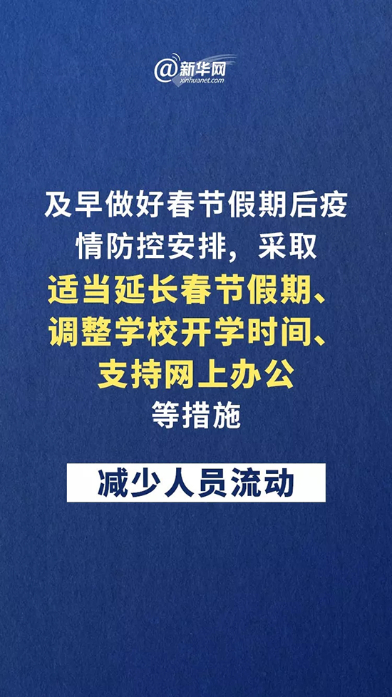 會議要求,要加強(qiáng)分類指導(dǎo),壓實(shí)屬地責(zé)任,精準(zhǔn)有效科學(xué)防控。各地要成立應(yīng)對疫情工作領(lǐng)導(dǎo)小組,黨政主要負(fù)責(zé)人要親自掛帥,防控工作不得有誤。加強(qiáng)疫情監(jiān)測,嚴(yán)格隔離確診患者,對疑似病例和密切接觸者要按醫(yī)學(xué)要求進(jìn)行隔離和檢查。發(fā)病人數(shù)較多城市要抓緊增加定點(diǎn)醫(yī)院、治療床位和隔離點(diǎn)。推遲、減少會議和大型活動。落實(shí)公共場所和交通工具檢控措施。農(nóng)村醫(yī)療衛(wèi)生條件薄弱,農(nóng)民工大批返鄉(xiāng),要高度重視農(nóng)村疫情防控,充分發(fā)揮基層組織和村醫(yī)作用,強(qiáng)化群防群控。及早做好春節(jié)假期后疫情防控安排,采取適當(dāng)延長春節(jié)假期、調(diào)整學(xué)校開學(xué)時(shí)間、支持網(wǎng)上辦公等措施,減少人員流動。嚴(yán)厲打擊防控物資囤積居奇等行為。各級財(cái)政要充分保障疫情防控、患者救治等經(jīng)費(fèi)。