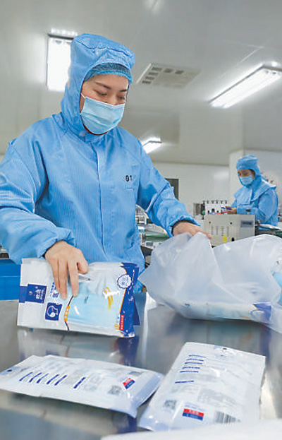 近日,各地口罩生產(chǎn)企業(yè)抓緊生產(chǎn),全力增加市場供應(yīng)。圖為浙江省德清縣一家口罩企業(yè)生產(chǎn)車間,工作人員在包裝口罩。王正 王玨 攝影報道(影像中國)