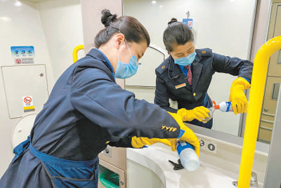 為應(yīng)對疫情,鐵路部門全力做好相關(guān)防控工作。圖為南昌開往南京的G1496次列車上,南昌客運段工作人員認真做好車廂清潔、消毒工作。鮑贛生 攝(人民視覺)