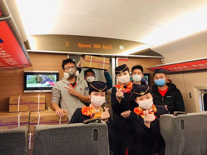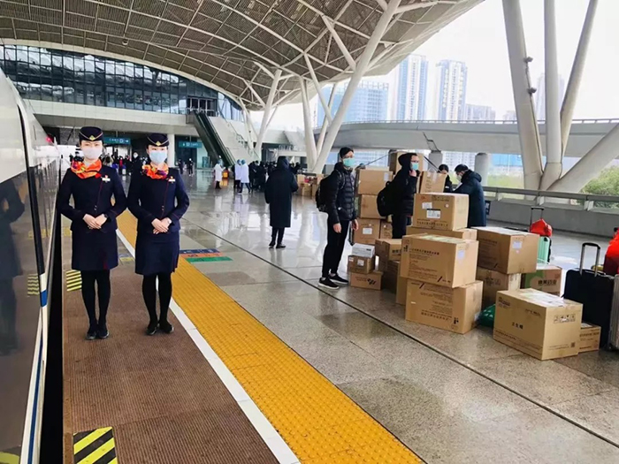 當(dāng)天下午,列車從鄭州東站返回廣州南站時,又接到一批特殊的禮物。中國鐵路鄭州局有限公司防控所支援武漢的醫(yī)療物資,搭乘高鐵車遞到武漢站。幾名旅客看到乘務(wù)員姑娘們忙碌地搬運這些大箱子,都自告奮勇奮前來幫忙,大家齊心協(xié)力,不一會兒就把全部物資搬運上車。列車載著這些愛心物資,迅速送達(dá)武漢。