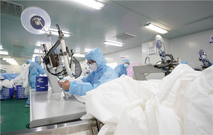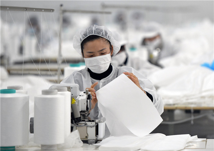 1月28日,在武漢市新洲區(qū)武漢協(xié)卓衛(wèi)生用品有限公司,工人在趕制防護(hù)服,該公司是生產(chǎn)手術(shù)服、防護(hù)服等產(chǎn)品的企業(yè)。 新華社記者 才揚(yáng) 攝