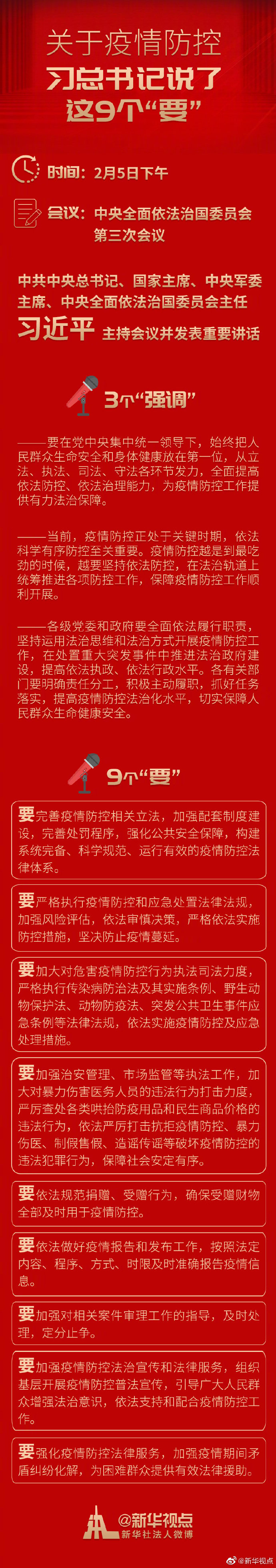 2月5日下午,中共中央總書(shū)記、國(guó)家主席、中央軍委主席、中央全面依法治國(guó)委員會(huì)主任習(xí)近平主持召開(kāi)中央全面依法治國(guó)委員會(huì)第三次會(huì)議強(qiáng)調(diào),全面提高依法防控依法治理能力,為疫情防控提供有力法治保障。