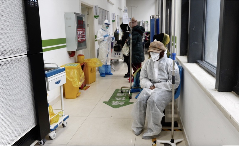 有發(fā)熱癥狀的患者集中在這里,老年人居多。有的患者穿著一次性雨衣,戴著醫(yī)用口罩在走廊邊上打點滴;還有人戴著泳鏡。