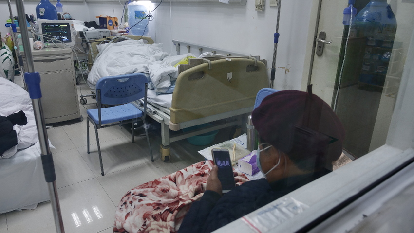 留觀室里的患者,幾乎每個人身邊立著一個近一人高的氧氣鋼瓶,更有病情嚴重者用上了呼吸機。他們大多數人坐在病床上,時而躺下,沒有交談。有的患者見到醫(yī)生時會哭泣;有的患者吸著氧,靜靜地發(fā)呆,眼睛沒有神。