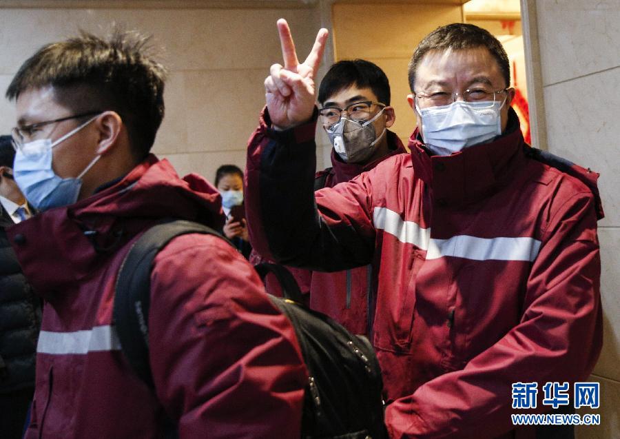 2月1日,中日友好醫(yī)院黨委書記周軍(右一)在出發(fā)前做出勝利的手勢。當日,為進一步加強武漢新型冠狀病毒感染的肺炎危重癥患者救治工作,國家衛(wèi)生健康委緊急組派中日友好醫(yī)院、北京大學第一醫(yī)院、北京大學人民醫(yī)院、北京大學第三醫(yī)院院長或書記帶領本院重癥醫(yī)學科主任、護士長等專業(yè)人員奔赴武漢,和前期組派的專業(yè)醫(yī)務人員一起開展危重癥患者救治工作。 新華社記者 張玉薇 攝