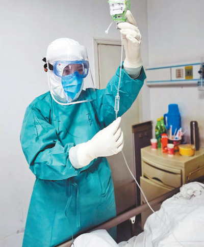 中山大學(xué)孫逸仙紀(jì)念醫(yī)院呼吸內(nèi)科二區(qū)“90后”護(hù)師袁漢珍,與同事一起馳援武漢市漢口醫(yī)院,堅(jiān)守病患救治一線。圖為袁漢珍正在為病人輸液。鮮 敢 張 陽攝影報(bào)道