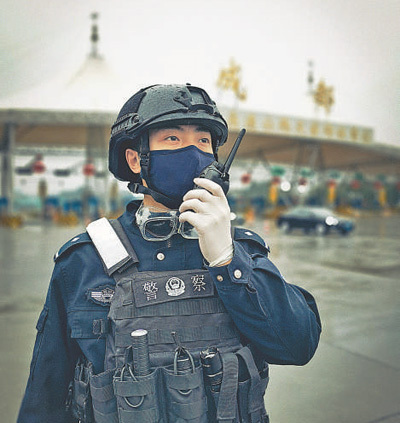 四川成都市青羊區(qū)公安分局民警楊桐今年28歲,新婚不久的他投入防疫一線,在高速公路收費(fèi)站執(zhí)勤,每天平均盤查1000余臺(tái)車輛,為2600余人測(cè)量體溫。圖為2月12日,楊桐在崗位上通過對(duì)講機(jī)與同事溝通工作。本報(bào)記者 王明峰攝