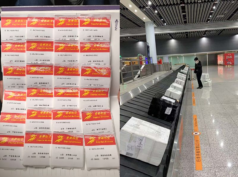 2月5日,首架貨機(jī)從西班牙馬德里(CA1026次航班)出發(fā),于當(dāng)天早上7:40分抵達(dá)了河南新鄭國際機(jī)場。在這架飛機(jī)上,載滿了口罩、護(hù)目鏡、防護(hù)服、消毒液等疫情急需物資,總計18個托盤,約5噸,371336件,總價值人民幣377450元。