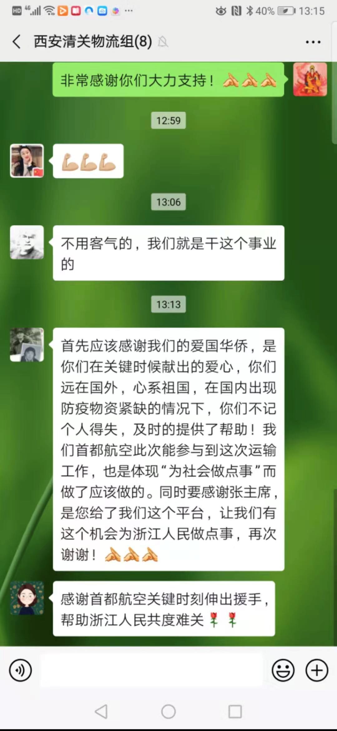 特別值得一提的是海航集團(tuán)的譚向東副董事長、高建副總裁,為了協(xié)助我們把捐贈物資盡快運回國內(nèi),高度重視,靠前指揮,第一時間給予全面而具體的支持。旗下的首都航空公司市場部副總顧凌毅、貨運中心高級經(jīng)理田國偉協(xié)調(diào)陳肖藝、倪福元、李小戈、首航西安基地總監(jiān)周瑞喜、海航速運境外管理部副總經(jīng)理池夢瑩以及郭宇萍等一批業(yè)務(wù)骨干加班加點,克服了時間緊張,物資量大,境外時差等諸多困難,創(chuàng)造了許多個“首航第一次”。蟠龍國際集團(tuán)、中遠(yuǎn)海運航空公司則為這場“空中接力”提供了高端快捷的航空物流平臺。而在第四批物資回運過程中,更是得到了溫州市防疫指揮部的鼎力相助,幫助我們把西班牙巴塞羅那收集點上的捐贈物資,從布魯塞爾轉(zhuǎn)道回國。