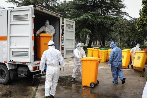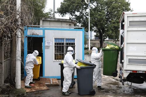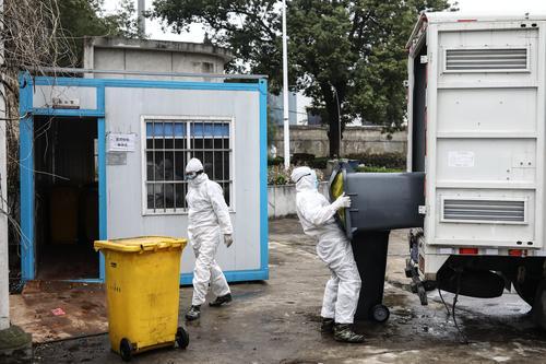 2月26日,湖北省武漢市,幾名醫(yī)療廢物處理員在搬運醫(yī)療垃圾。中青報·中青網(wǎng)記者 趙迪/攝