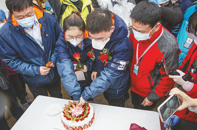 雷神山醫(yī)院院方得知這對“95后”新人的情況后,為他們倆舉行了這場“戰(zhàn)地婚禮”。(姜泓冰、張赫、葉佳琪、莫佳瑜 記者 張武軍攝)