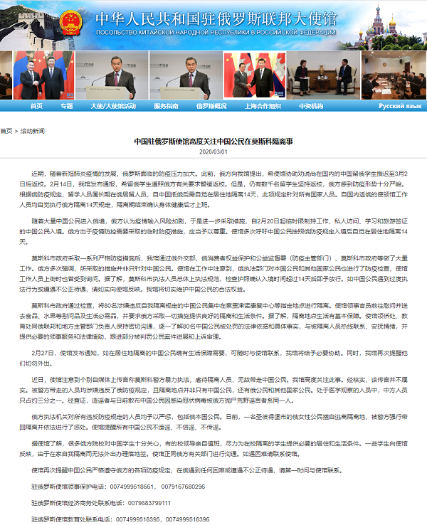近期,隨著新冠肺炎疫情的發(fā)展,俄羅斯面臨的防疫壓力加大。此前,俄方向我館提出,希使館協(xié)助勸說尚在國內(nèi)的中國留俄學(xué)生推遲至3月2日后返校。2月14日,我館發(fā)布通報(bào),希留俄學(xué)生遵照俄方有關(guān)要求暫緩返校。但是,仍有數(shù)千名留學(xué)生堅(jiān)持返校,俄方感到防疫形勢十分嚴(yán)峻。根據(jù)俄防疫規(guī)定,留學(xué)人員屬長期在俄居留人員,自中國抵俄后需自覺在居住地隔離14天,此項(xiàng)規(guī)定針對所有國家人員。自國內(nèi)返俄的使領(lǐng)館工作人員均自覺執(zhí)行俄方隔離14天規(guī)定,隔離期結(jié)束確認(rèn)身體健康后才上班。